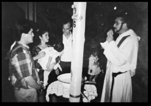 En la segunda imagen, Robert está junto a un joven matrimonio que bautiza a su hija. Él es el padrino de la niña y le hace caras graciosas y juguetonas para divertirla.