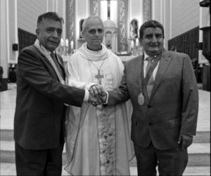 La tercera fotografía corresponde a la mediación entre dos políticos en disputa. El obispo Prevost consigue que se unan para enfrentar juntos uno de los problemas de la región.